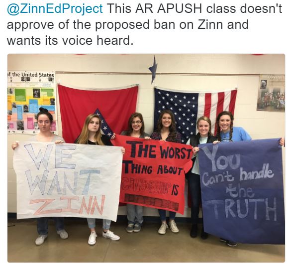 The Zinn Education Project defends the right of teachers in Arkansas to use materials by and about Howard Zinn. To date, there are more than 250 teachers in Arkansas who have signed up to access people’s history lessons from the Zinn Education Project website. One of those high school teachers and her U.S. history students tweeted their opposition to the HB 1834.